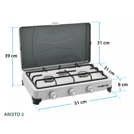 Fornello gas a 3 fuochi stabile e compatto, dotato di coperchio.